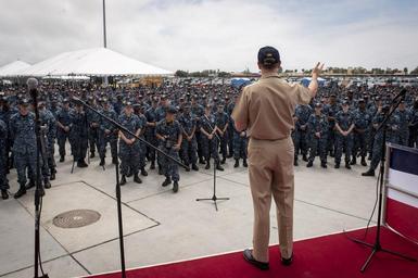 Keywords: adm. jonathan greenert admjonathangreenert cno chief of naval operations chiefofnavaloperations navy leadership navyleadership u.s. navy usnavy san diego sandiego calif. calif outdoor 150817-N-AT895-404 SAN DIEGO Calif. (Aug. 17, 2015) Chief of Naval Operations (CNO) Adm. Jonathan Greenert delivers remarks to crew members from USS George Washington (CVN 73) during a Cooks from the Valley barbecue at Naval Air Station North Island. George Washington completed a crew and equipment swap with the aircraft carrier USS Ronald Reagan (CVN 76) before beginning its transit to Norfolk, Virginia, where it will prepare for its mid-life refueling and complex overhaul (RCOH).(U.S. Navy photo by Mass Communication Specialist 1st Class Nathan Laird/Released) 150817-N-AT895-404 SAN DIEGO Calif. (Aug. 17, 2015) Chief of Naval Operations (CNO) Adm. Jonathan Greenert delivers remarks to crew members from USS George Washington (CVN 73) during a Cooks from the Valley barbecue at Naval Air Station North Island. George Washington completed a crew and equipment swap with the aircraft carrier USS Ronald Reagan (CVN 76) before beginning its transit to Norfolk, Virginia, where it will prepare for its mid-life refueling and complex overhaul (RCOH).(U.S. Navy photo by Mass Communication Specialist 1st Class Nathan Laird/Released) |