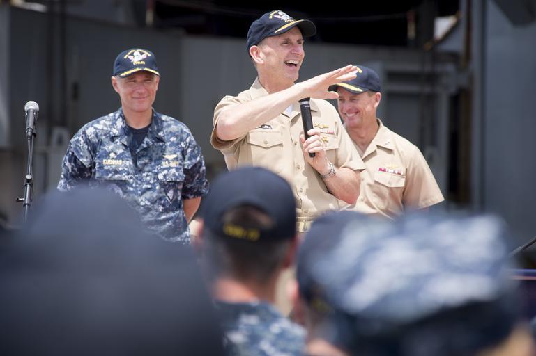 Keywords: adm. jonathan greenert admjonathangreenert cno chief of naval operations chiefofnavaloperations navy leadership navyleadership u.s. navy usnavy san diego sandiego calif. calif 150817-N-AT895-437 SAN DIEGO Calif. (Aug. 17, 2015) Chief of Naval Operations (CNO) Adm. Jonathan Greenert delivers remarks to crew members from USS George Washington (CVN 73) during a Cooks from the Valley barbecue at Naval Air Station North Island. George Washington completed a crew and equipment swap with the aircraft carrier USS Ronald Reagan (CVN 76) before beginning its transit to Norfolk, Virginia, where it will prepare for its mid-life refueling and complex overhaul (RCOH).(U.S. Navy photo by Mass Communication Specialist 1st Class Nathan Laird/Released) 150817-N-AT895-437 SAN DIEGO Calif. (Aug. 17, 2015) Chief of Naval Operations (CNO) Adm. Jonathan Greenert delivers remarks to crew members from USS George Washington (CVN 73) during a Cooks from the Valley barbecue at Naval Air Station North Island. George Washington completed a crew and equipment swap with the aircraft carrier USS Ronald Reagan (CVN 76) before beginning its transit to Norfolk, Virginia, where it will prepare for its mid-life refueling and complex overhaul (RCOH).(U.S. Navy photo by Mass Communication Specialist 1st Class Nathan Laird/Released) |
