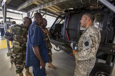 | Keywords: african air forces africanairforces african partnership flight africanpartnershipflight africom tour visit conference army aviation support facility armyaviationsupportfacility aasf uh-60a black hawk uh60ablackhawk black hawk blackhawk uh-60a uh60a uh-60 uh60 helicopter helicopters 1-150th assault helicopter battalion 1150thassaulthelicopterbattalion 1-150 ahb 1150ahb new jersey army national guard newjerseyarmynationalguard njarng new jersey national guard newjerseynationalguard njng army national guard armynationalguard arng soldier soldiers aviator aviators crew chief crewchief national guard nationalguard ng u.s. air forces in europe usairforcesineurope usafe u.s. air forces africa usairforcesafrica usafa maintenance logistics knowledge procedures regional military to military events regionalmilitarytomilitaryevents aviation capacity aviationcapacity enhance regional cooperation enhanceregionalcooperation cooperation increase interoperability increaseinteroperability interoperability africa angola burkina faso burkinafaso ghana mali niger nigeria senegal tunisia military united states air force unitedstatesairforce usaf air force airforce af joint base mcguire-dix-lakehurst jointbasemcguiredixlakehurst jbmdl n.j. nj new jersey newjersey aug. 31 2015 aug312015 photo by master sgt. mark c. olsen photobymastersgtmarkcolsen u.s. us Staff Sgt. Simon Debran, right, UH-60A Black Hawk crew chief, briefs visiting African air force members touring the New Jersey Army National Guard’s Army Aviation Support Facility during an AFRICOM conference at Joint Base McGuire-Dix-Lakehurst, N.J., Aug. 31, 2015. The African Partnership Flight visit to the Facility is part of a U.S. Air Forces in Europe and U.S. Air Forces Africa program, which includes military representatives from Angola, Burkina Faso, Ghana, Mali, Niger, Nigeria, Senegal and Tunisia that emphasized increased maintenance and logistics knowledge and procedures. The program was created to conduct regional military to military events with African air forces to build aviation capacity, enhance regional cooperation and increase interoperability. (U.S. Air National Guard photo by Master Sgt. Mark C. Olsen/Released) Staff Sgt. Simon Debran, right, UH-60A Black Hawk crew chief, briefs visiting African air force members touring the New Jersey Army National Guard’s Army Aviation Support Facility during an AFRICOM conference at Joint Base McGuire-Dix-Lakehurst, N.J., Aug. 31, 2015. The African Partnership Flight visit to the Facility is part of a U.S. Air Forces in Europe and U.S. Air Forces Africa program, which includes military representatives from Angola, Burkina Faso, Ghana, Mali, Niger, Nigeria, Senegal and Tunisia that emphasized increased maintenance and logistics knowledge and procedures. The program was created to conduct regional military to military events with African air forces to build aviation capacity, enhance regional cooperation and increase interoperability. (U.S. Air National Guard photo by Master Sgt. Mark C. Olsen/Released) |