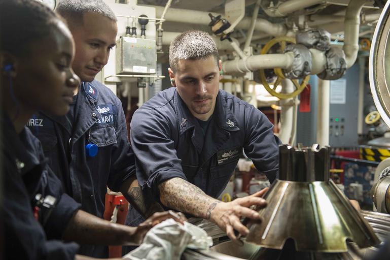 Keywords: uss farragut ussfarragut csg 12 csg12 engine room engineroom fuel oil transfer fueloiltransfer u.s. 6th fleet us6thfleet mediterranean sea mediterraneansea people 151017-N-VC236-011 MEDITERRANEAN SEA (October 17, 2015) - Gas Turbine System Technician (Mechanical) 1st Class Matthew Copenheaver, from Baltimore, and Gas Turbine System Technicians (Mechanical) 3rd Class Michael Ramirez and Takesha Williams, both from Chicago, clean a fuel oil transfer purifier aboard the Arleigh Burke-class guided-missile destroyer USS Farragut (DDG 99) October 17, 2015. Farragut, homeported in Mayport, Florida, is conducting naval operations in the U.S. 6th Fleet area of operations in support of U.S. national security interests in Europe. (U.S. Navy photo by Mass Communication Specialist 3rd Class Jackie Hart/Released) 151017-N-VC236-011 MEDITERRANEAN SEA (October 17, 2015) - Gas Turbine System Technician (Mechanical) 1st Class Matthew Copenheaver, from Baltimore, and Gas Turbine System Technicians (Mechanical) 3rd Class Michael Ramirez and Takesha Williams, both from Chicago, clean a fuel oil transfer purifier aboard the Arleigh Burke-class guided-missile destroyer USS Farragut (DDG 99) October 17, 2015. Farragut, homeported in Mayport, Florida, is conducting naval operations in the U.S. 6th Fleet area of operations in support of U.S. national security interests in Europe. (U.S. Navy photo by Mass Communication Specialist 3rd Class Jackie Hart/Released) |