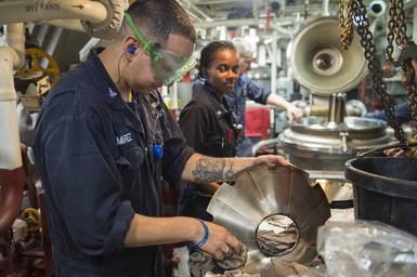 Keywords: uss farragut ussfarragut csg 12 csg12 engine room engineroom fuel oil transfer fueloiltransfer u.s. 6th fleet us6thfleet mediterranean sea mediterraneansea 151017-N-VC236-013 MEDITERRANEAN SEA (October 17, 2015) - Gas Turbine System Technicians (Mechanical) 3rd Class Michael Ramirez and Takesha Williams, both from Chicago, clean a fuel oil transfer purifier aboard the Arleigh Burke-class guided-missile destroyer USS Farragut (DDG 99) October 17, 2015. Farragut, homeported in Mayport, Florida, is conducting naval operations in the U.S. 6th Fleet area of operations in support of U.S. national security interests in Europe. (U.S. Navy photo by Mass Communication Specialist 3rd Class Jackie Hart/Released) 151017-N-VC236-013 MEDITERRANEAN SEA (October 17, 2015) - Gas Turbine System Technicians (Mechanical) 3rd Class Michael Ramirez and Takesha Williams, both from Chicago, clean a fuel oil transfer purifier aboard the Arleigh Burke-class guided-missile destroyer USS Farragut (DDG 99) October 17, 2015. Farragut, homeported in Mayport, Florida, is conducting naval operations in the U.S. 6th Fleet area of operations in support of U.S. national security interests in Europe. (U.S. Navy photo by Mass Communication Specialist 3rd Class Jackie Hart/Released) |
