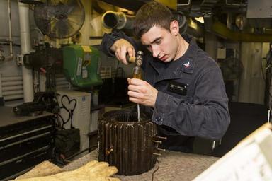 Keywords: uss kearsarge (lhd 3); arciaga; 26th marine expeditionary unit; usskearsargelhd3arciaga26thmarineexpeditionaryunit mediteranian sea mediteraniansea usa uss kearsarge (lhd 3); arciaga; 26th marine expeditionary unit; lhd 3; underway; engineering usskearsargelhd3arciaga26thmarineexpeditionaryunitlhd3underwayengineering indoor 151020-N-KW492-076 MEDITERRANEAN SEA (Oct. 20, 2015) Electrician's Mate 3rd Class Vincent Larocca, a motor rewind technician, from Dumont , New Jersey, flattens works on an engine part aboard the amphibious assault ship USS Kearsarge (LHD 3) Oct. 20, 2015. Kearsarge, deployed as part of the Kearsarge Amphibious Ready Group, is conducting naval operations in the U.S. 6th Fleet area of operations in support of U.S. national security interests in Europe. (U.S. Navy Photo by Mass Communication Specialist Seaman Apprentice Ryre Arciaga/Released) 151020-N-KW492-076 MEDITERRANEAN SEA (Oct. 20, 2015) Electrician's Mate 3rd Class Vincent Larocca, a motor rewind technician, from Dumont , New Jersey, flattens works on an engine part aboard the amphibious assault ship USS Kearsarge (LHD 3) Oct. 20, 2015. Kearsarge, deployed as part of the Kearsarge Amphibious Ready Group, is conducting naval operations in the U.S. 6th Fleet area of operations in support of U.S. national security interests in Europe. (U.S. Navy Photo by Mass Communication Specialist Seaman Apprentice Ryre Arciaga/Released) |