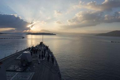 Keywords: us navy usnavy navy mc navymc npase-east npaseeast navy public affairs navypublicaffairs sailors europe 6th fleet 6thfleet uss donald cook ussdonaldcook ddg 75 ddg75 patrol snmg2 nato active endeavour activeendeavour souda bay soudabay greece outdoor sea ocean water sky coast landscape shore 151108-N-TC720-137 SOUDA BAY, Greece (Nov. 8, 2015) USS Donald Cook (DDG 75) gets underway from Souda Bay, Greece, following a regularly scheduled port visit Nov. 8, 2015. Donald Cook, an Arleigh Burke-class guided-missile destroyer, forward deployed to Rota, Spain is conducting a routine patrol in the U.S. 6th Fleet area of operations in support of U.S. national security interests in Europe. (U.S. Navy photo by Mass Communication Specialist 3rd Class Mat Murch/Released) 151108-N-TC720-137 SOUDA BAY, Greece (Nov. 8, 2015) USS Donald Cook (DDG 75) gets underway from Souda Bay, Greece, following a regularly scheduled port visit Nov. 8, 2015. Donald Cook, an Arleigh Burke-class guided-missile destroyer, forward deployed to Rota, Spain is conducting a routine patrol in the U.S. 6th Fleet area of operations in support of U.S. national security interests in Europe. (U.S. Navy photo by Mass Communication Specialist 3rd Class Mat Murch/Released)