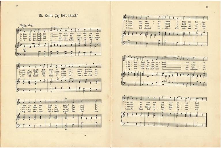 Keywords: 15 Kent gij het land, pagina 18 & 19.jpg Kun je nog zingen zing dan mee Muziek en teksten origineel gepubliceerd voor 1900 own 1915 author PD-old Kun je nog zingen zing dan mee