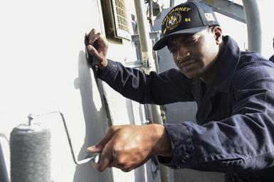 | Keywords: select 160303-N-FP878-045 MEDITERRANEAN SEA (March 3, 2016) Operations Specialist 1st Class Jermaine Weathers, from Chicago, conducts topside preservation aboard USS Carney (DDG 64) March 3, 2016. Carney, an Arleigh Burke-class guided-missile destroyer, forward deployed to Rota, Spain, is conducting a routine patrol in the U. S. 6th Fleet area of operations in support of U.S. national security interests in Europe. (U.S. Navy photo by Mass Communication Specialist 1st Class Theron J. Godbold/Released) 160303-N-FP878-045 MEDITERRANEAN SEA (March 3, 2016) Operations Specialist 1st Class Jermaine Weathers, from Chicago, conducts topside preservation aboard USS Carney (DDG 64) March 3, 2016. Carney, an Arleigh Burke-class guided-missile destroyer, forward deployed to Rota, Spain, is conducting a routine patrol in the U. S. 6th Fleet area of operations in support of U.S. national security interests in Europe. (U.S. Navy photo by Mass Communication Specialist 1st Class Theron J. Godbold/Released) |