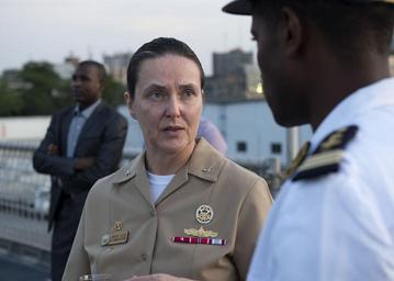 Keywords: africa partnership station; africa partnership station 2016; aps16; aps; c6f; usns; spearhead; navy; partnership; military sealift command; u.s. navy; navy; amlep16 africapartnershipstationafricapartnershipstation2016aps16apsc6fusnsspearheadnavypartnershipmilitarysealiftcommandusnavynavyamlep16 douala, cameroon doualacameroon people 160312-N-QF605-021 DOUALA, Cameroon (March 12, 2016) - Capt. Heidi Agle, commodore, military Sealift Command Europe and Africa, speaks with Lt. Yves Sokamte, commanding officer of Battle Boat Ebodje during the closing ceremony reception of African Maritime Law Enforcement Partnership Cameroon aboard USNS Spearhead (T-EPF 1), March 12, 2016. The Military Sealift Command expeditionary fast transport vessel USNS Spearhead is on a scheduled deployment to the U.S. 6th Fleet area of operations to support the international collaborative capacity-building program Africa Partnership Station. (U.S. Navy photo by Mass Communication Specialist 1st Class Amanda Dunford/Released) 160312-N-QF605-021 DOUALA, Cameroon (March 12, 2016) - Capt. Heidi Agle, commodore, military Sealift Command Europe and Africa, speaks with Lt. Yves Sokamte, commanding officer of Battle Boat Ebodje during the closing ceremony reception of African Maritime Law Enforcement Partnership Cameroon aboard USNS Spearhead (T-EPF 1), March 12, 2016. The Military Sealift Command expeditionary fast transport vessel USNS Spearhead is on a scheduled deployment to the U.S. 6th Fleet area of operations to support the international collaborative capacity-building program Africa Partnership Station. (U.S. Navy photo by Mass Communication Specialist 1st Class Amanda Dunford/Released) |