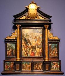 Keywords: 1604 Elsheimer Kreuzaltar anagoria.JPG Artwork Creator Adam Elsheimer Verherrlichung des Kreuzes durch Heilige Propheten und Engel Die sechs begleitenden Szenen erzählen die Legende von der Auffindung der Rückeroberung und dem Rücktransport jenes Kreuzes an dem Jesus gestorben sein soll nach Jerusalem <br> Auf der Mitteltafel Verherrlichung des Kreuzes sind rechts unten die Patriarchen einschließlich Moses Abraham und König David abgebildet Jonas sitzt auf dem Wal mit zum Kreuz erhobenem Blick die hl Katharina und Maria Magdalena sind in schwesterlicher Umarmung Im Vordergrund ist ein Streit zwischen dem hl Sebastian und den 4 Kirchenvätern Papst Gregor Die sechs umrahmenden Szenen erzählen die Legende von der Auffindung und dem Rücktransport des Kreuzes an dem Jesus gestorben sein soll nach Jerusalem In the central panel the Glorification of the cross by the Saints the prophets and the angele is shown On the right are the 4 the patriarchs including Moses Abraham and King David Jonas is sitting on the fish looking up towards the cross and St Catherine and Mary Magdalene are in a sisterly embrace In the foreground is a disputation between St Sebastian and the 4 Fathers of the Church Pope Gregory St Jerome St Ambrose and St Augustine with the first Christian martyrs St Stephen and St Laurence - 1603 1605 Oil on copper langSwitch versilbert silvered cm 107 133 6 ; LangSwitch Mittelteil central panel centre middenpaneel cm 48 5 35 Institution Städel Städel http //www staedelmuseum de/de/geschichte Geschichte des Museums http //www staedelmuseum de/de/highlights-der-sammlung Highlights der Sammlung/http //www staedelmuseum de/en/collection-highlights Collection Highlights<br>http //www adam-elsheimer com/www adam-elsheimer com/FrankfurterAltar html Adam Elsheimer Gesellschaft e V object history LangSwitch Mittelteil central panel centre middenpaneel ProvenanceEvent 1950 acquisition Städel de bis 1981 werden die restlichen 6 Täfelchen nacheinander entdeckt und angekauft Das letzte Bild wurde 1981 in Australien gefunden und am 4 10 1981 bei Christies erworben credit line Teileigentum des Städelschen Museums-Vereins e V accession number 2024 2054 2118 2119 2131 2140 2142 own Anagoria 2013-08-07 PD-old-100-1923 DEFAULTSORT Elsheimer Adam; Altar piece Frankfurter Kreuzaltar 00 Gesamtansicht; Stadel ImageNote 1 1085 1374 968 1355 3156 3673 2 300px ImageNoteEnd 1 ImageNote 2 1066 2986 447 423 3156 3673 2 Ausgrabung der Kreuze 300px ImageNoteEnd 2 ImageNote 3 797 981 1648 123 3156 3673 2 title The Altarpiece of the Holy Cross Der Frankfurter Kreuzaltar Die Auffindung und Verherrlichung des wahren Kreuzes ImageNoteEnd 3 Paintings by Adam Elsheimer German paintings in the Städel Baroque paintings in the Städel 1604 altars Reredos 1600s altars in Germany Files by User anagoria |