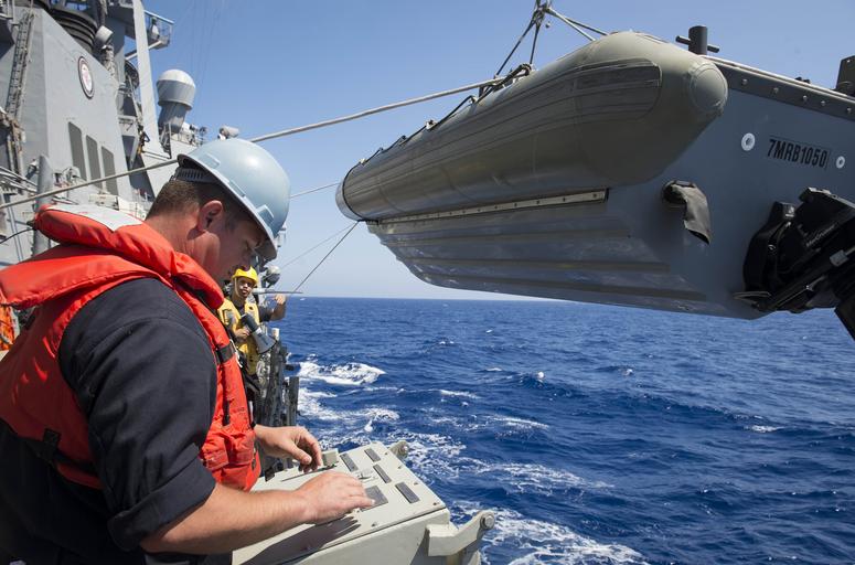 Keywords: uss porter (ddg 78) ussporterddg78 boatswain's mate boatswainsmate slewing arm davit slewingarmdavit mediterranean sea mediterraneansea outdoor 160511-N-FQ994-046 MEDITERRANEAN SEA (May 11, 2016) Boatswain's Mate 2nd Class Isiah Price, from Warner Robins, Georgia, lowers a rigid-hull inflatable boat from USS Porter (DDG 78) by using the ship's slewing arm davit May 11, 2016. Porter, an Arleigh Burke-class guided-missile destroyer, forward-deployed to Rota, Spain, is conducting a routine patrol in the U.S. 6th Fleet area of operations in support of U.S. national security interests in Europe. (U.S. Navy Photo by Mass Communication Specialist 3rd Class Robert S. Price/Released) 160511-N-FQ994-046 MEDITERRANEAN SEA (May 11, 2016) Boatswain's Mate 2nd Class Isiah Price, from Warner Robins, Georgia, lowers a rigid-hull inflatable boat from USS Porter (DDG 78) by using the ship's slewing arm davit May 11, 2016. Porter, an Arleigh Burke-class guided-missile destroyer, forward-deployed to Rota, Spain, is conducting a routine patrol in the U.S. 6th Fleet area of operations in support of U.S. national security interests in Europe. (U.S. Navy Photo by Mass Communication Specialist 3rd Class Robert S. Price/Released) |