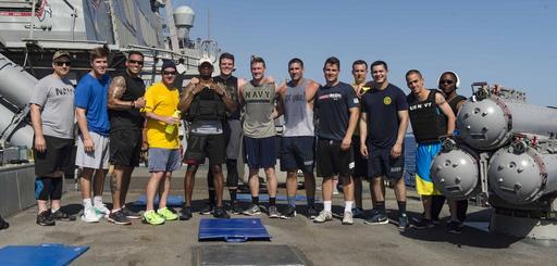 | Keywords: u.s. navy; sailor; deployment; 5th fleet; 6th fleet; navy; uss s usnavysailordeployment5thfleet6thfleetnavyusss atlantic ocean atlanticocean outdoor 160530-N-GP524-171 MEDITERRANEAN SEA (May 30, 2016) Sailors assigned to USS Stout (DDG 55) completed the Memorial Day MURPH Challenge honoring the fallen Lt. Michael Murphy through physical fitness while transiting the Mediterranean Sea May 30, 2016. Stout, an Arleigh Burke-class guided-missile destroyer, deployed as part of the Eisenhower Carrier Strike Group, is conducting naval operations in the U.S. 6th Fleet area of operations in support of U.S. national security interests in Europe. (U.S. Navy photo by Mass Communication Specialist 3rd Class Bill Dodge/Released) 160530-N-GP524-171 MEDITERRANEAN SEA (May 30, 2016) Sailors assigned to USS Stout (DDG 55) completed the Memorial Day MURPH Challenge honoring the fallen Lt. Michael Murphy through physical fitness while transiting the Mediterranean Sea May 30, 2016. Stout, an Arleigh Burke-class guided-missile destroyer, deployed as part of the Eisenhower Carrier Strike Group, is conducting naval operations in the U.S. 6th Fleet area of operations in support of U.S. national security interests in Europe. (U.S. Navy photo by Mass Communication Specialist 3rd Class Bill Dodge/Released) |