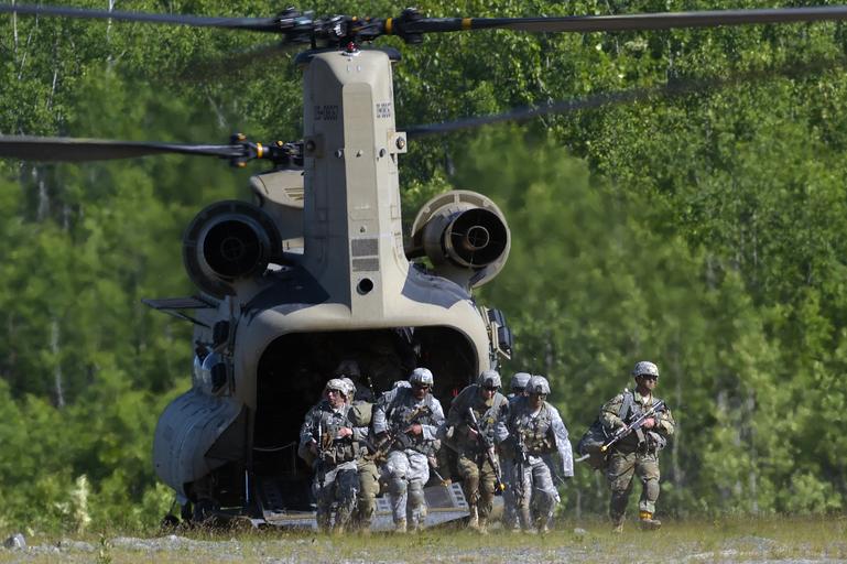 Keywords: soldiers; army; u.s. army; u.s. army alaska; usarpac; u.s. army soldiersarmyusarmyusarmyalaskausarpacusarmy joint base elmendorf-richardson jointbaseelmendorfrichardson alaska usa soldiers; army; u.s. army; u.s. army alaska; usarpac; u.s. army pacific; airborne; paratroopers; jgsdf; japanese ground self-defense force; arctic aurora; pacific partnership; pacom; pacific command soldiersarmyusarmyusarmyalaskausarpacusarmypacificairborneparatroopersjgsdfjapanesegroundselfdefenseforcearcticaurorapacificpartnershippacompacificcommand outdoor Paratroopers assigned to the 3rd Battalion, 509th Parachute Infantry Regiment, 4th Infantry Brigade Combat Team (Airborne), 25th Infantry Division, U.S. Army Alaska, disembark from a CH-47 Chinook helicopter for training with Japan Ground Self-Defense Force paratroopers at Joint Base Elmendorf-Richardson, Alaska, June 9, 2016, during Exercise Arctic Aurora. Arctic Aurora is a yearly bilateral training exercise involving elements of the Spartan Brigade and the JGSDF, which focuses on strengthening ties between the two by executing combined small unit airborne proficiency operations and basic small arms marksmanship. (U.S. Air Force photo/Justin Connaher) Paratroopers assigned to the 3rd Battalion, 509th Parachute Infantry Regiment, 4th Infantry Brigade Combat Team (Airborne), 25th Infantry Division, U.S. Army Alaska, disembark from a CH-47 Chinook helicopter for training with Japan Ground Self-Defense Force paratroopers at Joint Base Elmendorf-Richardson, Alaska, June 9, 2016, during Exercise Arctic Aurora. Arctic Aurora is a yearly bilateral training exercise involving elements of the Spartan Brigade and the JGSDF, which focuses on strengthening ties between the two by executing combined small unit airborne proficiency operations and basic small arms marksmanship. (U.S. Air Force photo/Justin Connaher) |