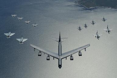 | Keywords: air force airforce air power airpower aircraft america b-52 b52 baltic operations 2016 balticoperations2016 baltic sea balticsea baltops baltops 2016 baltops2016 eurofighter typhoon eurofightertyphoon f-16 f16 fighting falcon fightingfalcon german air force germanairforce germany gripen poland polish air force polishairforce sweden swedish air force swedishairforce u.s. us u.s. air force usairforce pl outdoor text A U.S. Air Force B-52 Stratofortress leads a formation of aircraft including two Polish air force F-16 Fighting Falcons, four U.S. Air Force F-16 Fighting Falcons, two German Eurofighter Typhoons and four Swedish Gripens over the Baltic Sea, June 9, 2016. Deployed forces are working in tandem with naval forces to enhance flexibility and interoperability with participating NATO allies and partner nations by conducting a series of realistic, combined flying training including air defense, maritime awareness and support to amphibious operations during Baltic Operations 2016. (U.S. Air Force photo/Senior Airman Erin Babis) A U.S. Air Force B-52 Stratofortress leads a formation of aircraft including two Polish air force F-16 Fighting Falcons, four U.S. Air Force F-16 Fighting Falcons, two German Eurofighter Typhoons and four Swedish Gripens over the Baltic Sea, June 9, 2016. Deployed forces are working in tandem with naval forces to enhance flexibility and interoperability with participating NATO allies and partner nations by conducting a series of realistic, combined flying training including air defense, maritime awareness and support to amphibious operations during Baltic Operations 2016. (U.S. Air Force photo/Senior Airman Erin Babis) |
