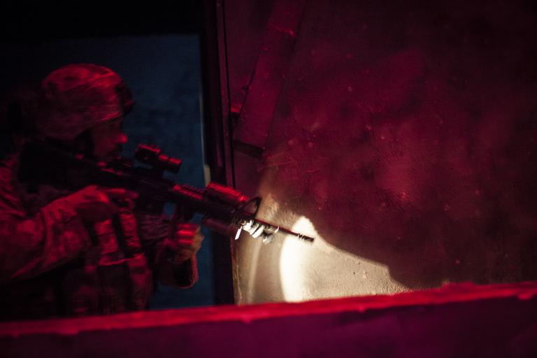 Keywords: U.S. Air Force Tech. Sgt. David Pabon moves tactically through an indoor Military Operations in Urban Terrain (MOUT) site at the New Jersey National Guard's Joint Training & Training Development Center (JT2DC), Joint Base McGuire-Dix-Lakehurst, N.J., June 16, 2016. Pabon is a Security Forces specialist assigned to the New Jersey Air National Guard's 177th Security Forces Squadron. The 177th Security Forces Squadron was utilizing the ability for the JT2DC's training areas to simulate low-light conditions in an urban environment. The red and blue lighting simulates a moonlit night as seen through night vision devices. (U.S. Air National Guard photo by Tech. Sgt. Matt Hecht/Released) usaf usairforce airnationalguard newjersey 177thsecurityforcessquadron m4 training jointbasemcguiredixlakehurst jt2dc nj usa publicdomain free |