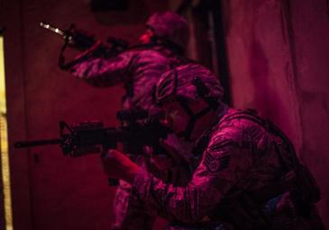 Keywords: usaf u.s. air force usairforce air national guard airnationalguard new jersey newjersey 177th security forces squadron 177thsecurityforcessquadron m4 training joint base mcguire-dix-lakehurst jointbasemcguiredixlakehurst jt2dc n.j. nj usa public domain publicdomain free indoor U.S. Air Force Staff Sgt. Christopher Raine, front, and Tech. Sgt. Anthony Lemons provide cover for teammates during training at an indoor Military Operations in Urban Terrain (MOUT) site at the New Jersey National Guard's Joint Training & Training Development Center (JT2DC), Joint Base McGuire-Dix-Lakehurst, N.J., June 16, 2016. Raine and Lemons are Security Forces specialists assigned to the New Jersey Air National Guard's 177th Security Forces Squadron. The 177th Security Forces Squadron was utilizing the ability for the JT2DC's training areas to simulate low-light conditions in an urban environment. The red and blue lighting simulates a moonlit night as seen through night vision devices. (U.S. Air National Guard photo by Tech. Sgt. Matt Hecht/Released) U.S. Air Force Staff Sgt. Christopher Raine, front, and Tech. Sgt. Anthony Lemons provide cover for teammates during training at an indoor Military Operations in Urban Terrain (MOUT) site at the New Jersey National Guard's Joint Training & Training Development Center (JT2DC), Joint Base McGuire-Dix-Lakehurst, N.J., June 16, 2016. Raine and Lemons are Security Forces specialists assigned to the New Jersey Air National Guard's 177th Security Forces Squadron. The 177th Security Forces Squadron was utilizing the ability for the JT2DC's training areas to simulate low-light conditions in an urban environment. The red and blue lighting simulates a moonlit night as seen through night vision devices. (U.S. Air National Guard photo by Tech. Sgt. Matt Hecht/Released) |