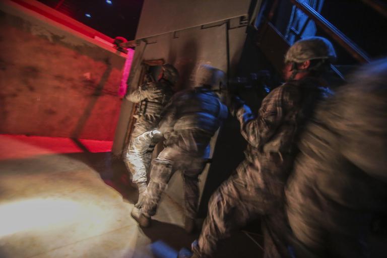 Keywords: usaf u.s. air force usairforce air national guard airnationalguard new jersey newjersey 177th security forces squadron 177thsecurityforcessquadron m4 training joint base mcguire-dix-lakehurst jointbasemcguiredixlakehurst jt2dc n.j. nj usa public domain publicdomain free U.S. Air Force Airmen from the New Jersey Air National Guard's 177th Security Forces Squadron move tactically through an indoor Military Operations in Urban Terrain (MOUT) site at the New Jersey National Guard's Joint Training & Training Development Center (JT2DC), Joint Base McGuire-Dix-Lakehurst, N.J., June 16, 2016. The 177th Security Forces Squadron was utilizing the ability for the JT2DC's training areas to simulate low-light conditions in an urban environment. The red and blue lighting simulates a moonlit night as seen through night vision devices. (U.S. Air National Guard photo by Tech. Sgt. Matt Hecht/Released) U.S. Air Force Airmen from the New Jersey Air National Guard's 177th Security Forces Squadron move tactically through an indoor Military Operations in Urban Terrain (MOUT) site at the New Jersey National Guard's Joint Training & Training Development Center (JT2DC), Joint Base McGuire-Dix-Lakehurst, N.J., June 16, 2016. The 177th Security Forces Squadron was utilizing the ability for the JT2DC's training areas to simulate low-light conditions in an urban environment. The red and blue lighting simulates a moonlit night as seen through night vision devices. (U.S. Air National Guard photo by Tech. Sgt. Matt Hecht/Released) |