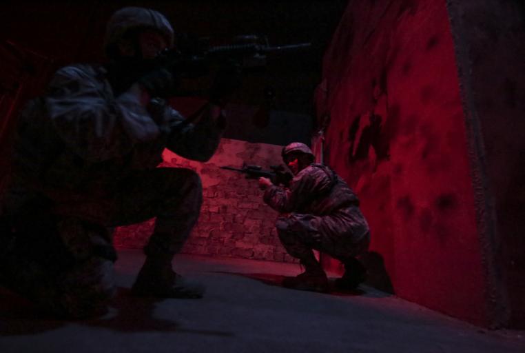 Keywords: usaf u.s. air force usairforce air national guard airnationalguard new jersey newjersey 177th security forces squadron 177thsecurityforcessquadron m4 training joint base mcguire-dix-lakehurst jointbasemcguiredixlakehurst jt2dc n.j. nj usa public domain publicdomain free indoor Two U.S. Air Force Airmen from the New Jersey Air National Guard's 177th Security Forces Squadron provide cover for each other during training at an indoor Military Operations in Urban Terrain (MOUT) site at the New Jersey National Guard's Joint Training & Training Development Center (JT2DC), Joint Base McGuire-Dix-Lakehurst, N.J., June 16, 2016. The 177th Security Forces Squadron was utilizing the ability for the JT2DC's training areas to simulate low-light conditions in an urban environment. The red and blue lighting simulates a moonlit night as seen through night vision devices. (U.S. Air National Guard photo by Tech. Sgt. Matt Hecht/Released) Two U.S. Air Force Airmen from the New Jersey Air National Guard's 177th Security Forces Squadron provide cover for each other during training at an indoor Military Operations in Urban Terrain (MOUT) site at the New Jersey National Guard's Joint Training & Training Development Center (JT2DC), Joint Base McGuire-Dix-Lakehurst, N.J., June 16, 2016. The 177th Security Forces Squadron was utilizing the ability for the JT2DC's training areas to simulate low-light conditions in an urban environment. The red and blue lighting simulates a moonlit night as seen through night vision devices. (U.S. Air National Guard photo by Tech. Sgt. Matt Hecht/Released) |