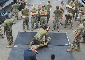Keywords: marine corps martial arts program marinecorpsmartialartsprogram mcmap dock landing ship docklandingship uss whidbey island usswhidbeyisland lsd 41 lsd41 atlantic ocean atlanticocean people outdoor 160706-N-TI017-052 ATLANTIC OCEAN (July 6, 2016) Marines from the 22nd Marine Expeditionary Unit practice submission techniques during Marine Corps Martial Arts Program training aboard the amphibious dock landing ship USS Whidbey Island (LSD 41) July 6, 2016. Whidbey Island is deployed with the Wasp Amphibious Ready Group to support maritime security operations and theater security cooperation efforts in the U.S. 6th Fleet area of operations. (U.S. Navy photo by Mass Communication Specialist 2nd Class Nathan R. McDonald/Released) 160706-N-TI017-052 ATLANTIC OCEAN (July 6, 2016) Marines from the 22nd Marine Expeditionary Unit practice submission techniques during Marine Corps Martial Arts Program training aboard the amphibious dock landing ship USS Whidbey Island (LSD 41) July 6, 2016. Whidbey Island is deployed with the Wasp Amphibious Ready Group to support maritime security operations and theater security cooperation efforts in the U.S. 6th Fleet area of operations. (U.S. Navy photo by Mass Communication Specialist 2nd Class Nathan R. McDonald/Released) |