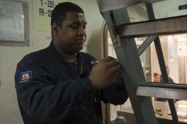 | Keywords: people 160816-N-ZE250-031 MEDITERRANEAN SEA (Aug. 16, 2016) - Machinist's Mate 1st Class Ericsson Soares removes a railing on a ladder in preparation to move a refrigeration unit aboard USS Carney (DDG 64) Aug. 16, 2016. Carney, an Arleigh Burke-class guided-missile destroyer, forward-deployed to Rota, Spain, is conducting a routine patrol in the U.S. 6th fleet area of operations in support of U.S. national security interests in Europe. (U.S. Navy photo by Mass Communication Specialist 3rd Class Weston Jones/Released) 160816-N-ZE250-031 MEDITERRANEAN SEA (Aug. 16, 2016) - Machinist's Mate 1st Class Ericsson Soares removes a railing on a ladder in preparation to move a refrigeration unit aboard USS Carney (DDG 64) Aug. 16, 2016. Carney, an Arleigh Burke-class guided-missile destroyer, forward-deployed to Rota, Spain, is conducting a routine patrol in the U.S. 6th fleet area of operations in support of U.S. national security interests in Europe. (U.S. Navy photo by Mass Communication Specialist 3rd Class Weston Jones/Released) |