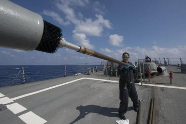 | Keywords: uss carney (ddg 64); 6th fleet; usscarneyddg646thfleet mediterranean sea mediterraneansea outdoor 160913-N-ZE250-077 MEDITERRANEAN SEA (Sept. 13, 2016) - Gunner's Mate 2nd Class Meghan Smith cleans the barrel of a MK 45 5-inch light weight gun during post fire maintenance aboard USS Carney (DDG 64) while on patrol in the Mediterranean Sea Sept. 13, 2016. Carney, an Arleigh Burke-class guided-missile destroyer, forward-deployed to Rota, Spain, is conducting a routine patrol in the U.S. 6th fleet area of operations in support of U.S. national security interests in Europe. (U.S. Navy photo by Mass Communication Specialist 3rd Class Weston Jones/Released) 160913-N-ZE250-077 MEDITERRANEAN SEA (Sept. 13, 2016) - Gunner's Mate 2nd Class Meghan Smith cleans the barrel of a MK 45 5-inch light weight gun during post fire maintenance aboard USS Carney (DDG 64) while on patrol in the Mediterranean Sea Sept. 13, 2016. Carney, an Arleigh Burke-class guided-missile destroyer, forward-deployed to Rota, Spain, is conducting a routine patrol in the U.S. 6th fleet area of operations in support of U.S. national security interests in Europe. (U.S. Navy photo by Mass Communication Specialist 3rd Class Weston Jones/Released) |