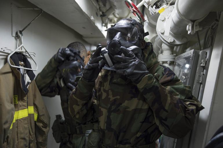 | Keywords: uss carney (ddg 64); 6th fleet; usscarneyddg646thfleet mediterranean sea mediterraneansea 161104-N-ZE250-020   MEDITERRANEAN SEA (Nov. 4, 2016) - Petty Officer 2nd Class Ahmed Buhari, right, and Seaman Cordell Baham don mission orientated protective posture gear aboard during a chemical, biological and radiological attack drill aboard USS Carney (DDG 64) while on patrol in the Mediterranean Sea Nov. 4, 2016. Carney, an Arleigh Burke-class guided-missile destroyer, forward-deployed to Rota, Spain, is conducting a routine patrol in the U.S. 6th fleet area of operations in support of U.S. national security interests in Europe. (U.S. Navy photo by Petty Officer 3rd Class Weston Jones/Released)  161104-N-ZE250-020   MEDITERRANEAN SEA (Nov. 4, 2016) - Petty Officer 2nd Class Ahmed Buhari, right, and Seaman Cordell Baham don mission orientated protective posture gear aboard during a chemical, biological and radiological attack drill aboard USS Carney (DDG 64) while on patrol in the Mediterranean Sea Nov. 4, 2016. Carney, an Arleigh Burke-class guided-missile destroyer, forward-deployed to Rota, Spain, is conducting a routine patrol in the U.S. 6th fleet area of operations in support of U.S. national security interests in Europe. (U.S. Navy photo by Petty Officer 3rd Class Weston Jones/Released)   |
