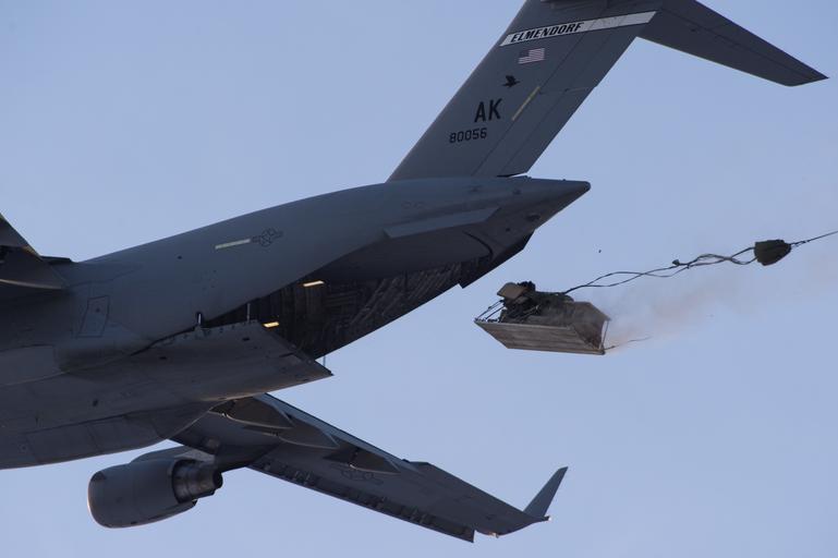 | Keywords: airborne parachute field artillery parachutefieldartillery live fire livefire alaska northern command northerncommand norcom c-17 globemaster iii c17globemasteriii joint base elmendorf-richardson jointbaseelmendorfrichardson united states unitedstates us aircraft airplane vehicle outdoor jet airplane wing A U.S. Air Force C-17 Globemaster III, assigned to the 517th Airlift Squadron, drops a heavy equipment pallet over Malemute drop zone, Joint Base Elmendorf-Richardson, Alaska, Nov. 22, 2016. After dropping two heavy equipment pallets, each holding a 105 mm howitzer, paratroopers assigned to A Battery, 2nd Battalion, 377th Parachute Field Artillery Regiment, 4th Infantry Brigade Combat Team (Airborne), 25th Infantry Division, U.S. Army Alaska, conducted a training airborne assault. (U.S. Air Force photo/Alejandro Pena) A U.S. Air Force C-17 Globemaster III, assigned to the 517th Airlift Squadron, drops a heavy equipment pallet over Malemute drop zone, Joint Base Elmendorf-Richardson, Alaska, Nov. 22, 2016. After dropping two heavy equipment pallets, each holding a 105 mm howitzer, paratroopers assigned to A Battery, 2nd Battalion, 377th Parachute Field Artillery Regiment, 4th Infantry Brigade Combat Team (Airborne), 25th Infantry Division, U.S. Army Alaska, conducted a training airborne assault. (U.S. Air Force photo/Alejandro Pena) |