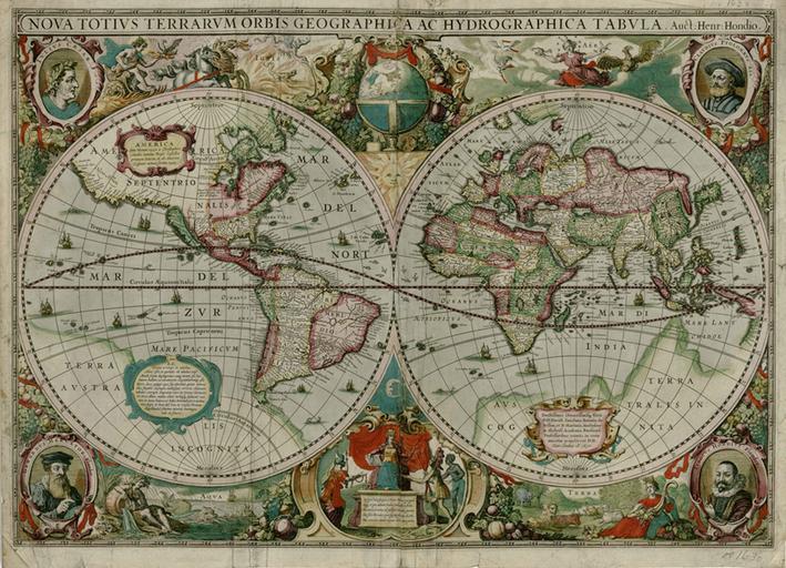 Keywords: 1630MapDarlingtonCollection Pitt.jpg 1630 Nova totius terrarum orbis geographica Map by Hendrik Hondius Relief shown pictorially; Map within decorative border with portraits of Julius Caesar Ptolomey Gerhard Mercator and Jodocus Hondius and tableaus depicting the 4 elements Earth Air Fire Water http //digital library pitt edu/d/darlington/ Darlington Digital Library of the University of Pittsburgh Hendrik Hondius 1630 PD by age PD-Art-100 Maps by Hendrik Hondius the Younger 1641 maps |
