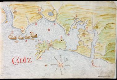 Keywords: 1632 Cardona Descripcion Indias (5).jpg bahía de Cádiz Primer mapa página 5 de las Descripciones geográphicas e hydrográphicas de muchas tierras y mares del Norte y Sur en las Indias en especial del descubrimiento del Reino de la California redactadas por el capitán Nicolás de Cardona tras su expedición de 1614 s of many northern and southern lands and seas in the Indies specifically the discovery of the kingdom of California written by captain Nicolás de Cardona after his expedition of 1614 1632-06-24 Descripciones geográficas e hidrográficas de muchas tierras y mares del Norte y Sur en las Indias en especial del descubrimiento del Reino de California hecho con trabajo e industria por el capitán y cabo Nicolás de Cardona dirigidas al Exmo D Gaspar de Guzmán Conde de Olivares http //bdh bne es/bnesearch/detalle/bdh0000011007 Biblioteca Digital Hispánica Biblioteca Nacional de España Nicolás de Cardona other versions PD-Art Descripciones geográphicas e hydrográphicas de muchas tierras y mares del Norte y Sur en las Indias en especial del descubrimiento del Reino de la California Maps by Nicolás de Cardona Watercolor maps Maps in Spanish Pictorial maps 1632 maps Old manuscript maps Bay of Cádiz Old maps of Cádiz |