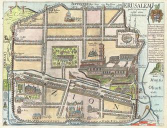 Keywords: 1650 Fuller Map of Jerusalem ( Israel, Palestine, Holy Land) - Geographicus - jerusalem-fuller-1650.jpg An extremely rare and altogether fascinating 1650 map of Jerusalem by Thomas Fuller Depicts the old walled city of Jerusalem during the reign of the Biblical King Solomon ca 961-922 BC On the whole this is a highly imaginative map of the city and likely bears no significant resemblance to the Jerusalem of Solomon Solomon's Temple appears at the right center with a tall bell tower and a highly Renaissance European design aesthetic At the center roughly where the Church of Holy Sepulture is located today is Solomon's menagerie The Baths of Bethesda in which an angel swims appear in the upper right approximately where they are said to be today Other sites of note include Domus David near the modern day Jaffa Gate the armory in the lower left the Kings House at bottom center Solomon's throne near the menagerie at center the golden gate at right center etc Throughout the streets are arranged with an uncanny geometric precisions Outside the walls Fuller identifies the Mount of Olives Montis Oliueti the Dragon Well the Fullers Field the King's Garden and despite purportedly being a map of Solomon's Jerusalem the Crucifixion on Calvary A armorial crest and a dedication to Eduardo Montagu or Edward Montagu the First Earl of Sandwich appears in the upper right quadrant Engraved by John Williams for the 1650 first edition of Thomas Fuller's A Pisgah-sight of Palestine This map is exceptionally rare and an important addition to any serious Israel - Palestine - Holy Land collection We have found no record of it appearing on the market in the last 10 years 1665 undated Size in 15 11 5 object history credit line accession number jerusalem-fuller-1650 Fuller Thomas <i>Pisgah-Sight Of Palestine And The Confines Thereof With The History of the Old and New Testament acted thereon </i> 1650 Geographicus-source PD-Art-100 Old maps of Jerusalem Thomas Fuller 1665 maps Salahi Bimarstan Jerusalem |