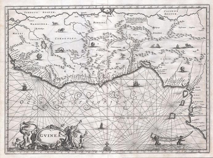 Keywords: 1670 Ogilby Map of West Africa ( Gold Coast, Slave Coast, Ivory Coast ) - Geographicus - Guinea-ogilby-1670.jpg This is an extraordinary 1670 map of West Africa by English cartographer John Ogilby Depicts the African Gold Coast Ivory Coast and Slave Coast from Guniea south through the modern nations of Sierra Leone Liberia Mali Burkina Faso Cote D ™Ivoire Ghana Togo Benin Nigeria Cameroon Equatorial Guinea and Gabon Ogilby modeled this map after the 1639 Hondius / Janesson map Here was can see the practice satirized by Jonathan Swift regarding the lack in information on the interior they had to place elephants for want of towns Indeed the interior is decorated with stylized renderings of African animals including lions elephants cheetahs and apes On the water several sailing vessels are depicted In the lower left an elaborate decorative Cartouche labeled the region simply Guinea On the bottom right two cherubic Africans haul a gigantic elephant tusk 1670 undated Size in 14 5 10 5 object history credit line accession number Guinea-ogilby-1670 Geographicus-source PD-Art-100 1670 maps 1670s maps of Africa 1670 Old maps of Sierra Leone 1670 Maps of the history of Liberia 1670 Old maps of Mali 1670 Maps of the history of Burkina Faso 1670 Old maps of Ghana 1670 Old maps of Togo 1670 Old maps of Benin 1670 Old maps of Nigeria 1670 Old maps of Cameroon 1670 Old maps of Equatorial Guinea 1670 Old maps of Gabon 1670 West Africa Maps by John Ogilby Maps in Latin Old maps of Burkina Faso Old maps of CĂ´te d'Ivoire Animals on maps Slave Coast |