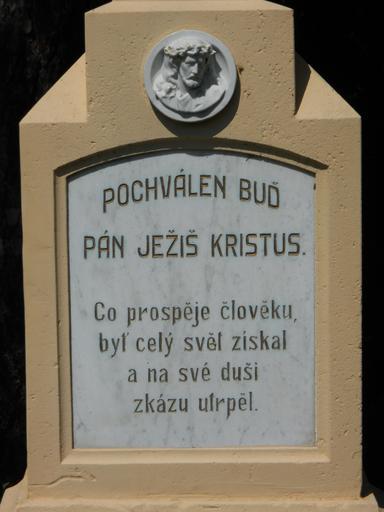 | Keywords: 16. kříž u hráze- Sedláčkův detail text.JPG cs Teracový kříž 2 Původně tento kříž býval na mlýnské cestě z Dukovan do dukovanského mlýna- nyní zatopeno a kříž přemístěn Nápisy na kříži Pochválen buď Pán Ježíš Kristus Co prospěje člověku byť celý svět získal a na své duši zkázu utrpěl Ke cti a chvále Boží věnovali manželé Antonín a Marie Sedláčkovi majitelé mlýna L P 1934 own Obecdukovany 1934 Crosses in Vysočina Region Dukovany | ||||