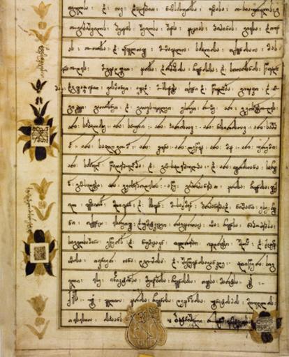 | Keywords: 1715. მეფე ვახtaნგ VI-ის სითარხნის წიგნი ბეჟან გოგიბაშვილისადმი.jpg ka 1715 მეფე ვახta გ VI-ის სითარხ ის წიგ ი ბეჟა გ გიბაშვილისადმი 2009-11-25 http //illuminateddocument ge/ge/album/index/1/georgian Illuminated Historical Documents from Georgian Archives Digitized by the National Center of Manuscripts Tbilisi Georgia PD-Art Uploaded with UploadWizard Georgia in the 1710s Vakhtang VI Mkhedruli royal charters | ||||