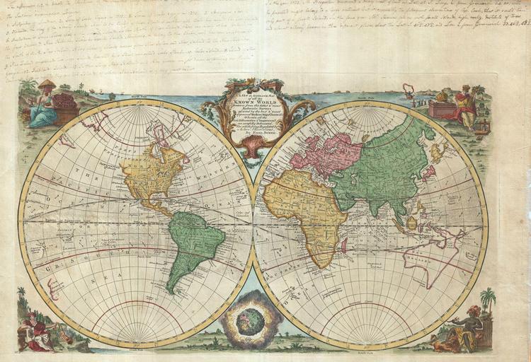 Keywords: 1744 Bowen Map of the World in Hemispheres - Geographicus - World-bowen-1744.jpg An extremely attractive 1744 decorative double hemisphere world map by the English cartographer Emmanuel Bowen This beautiful map covers the entire world as it was understood in the middle part of the 18th century before the explorations of Cook Wilkes and others Surrounded by decorative engravings of women representing each of the continents America in the upper left Europe in the upper right Asia in the lower left and Africa in the lower right The decorative baroque title cartouche appears at top center Color coding according to continent Limited inland detail but major cities geographical landmarks and regions are noted In the tropics ocean currents are identified “ a very unusual addition This map is most interesting for its treatment of the western coast of America the Pacific and most importantly Australia Bowen issued this map during a dark period in Australian exploration the seventy-some years between the navigations of William Dampier in 1699 and Tobias Furneaux in 1773 Consequently most of the cartographic information on this map dates to 17th century Dutch expeditions to Australia ™s western coast such as those of Abel Tasman and William Janszoon Consequently we see a very ephemeral speculative mapping of the continent with Van Diemens ™s Land Tasmania and New Guinea attached to the mainland The unexplored eastern coast of the continent is mapped simply as a straight line running from New Guinea directly south to the tip of Tasmania New Zealand appears in a very embryonic form as a single landmass with no western shore This most likely conforms to Abel Tasman ™s 1642 sighting of the western coast of South Island Another curious landmass appearing to the northeast of New Holland or Australia and to the west of New Zealand is labeled H Ghost Land ™ From its geographical situation it may represent New Caledonia though it was not officially discovered until Captain Cook landed there in 1774 Just to the north of New Zealand yet another mysterious landmass appears this one is called Tierra de Espirio Sancto a speculative enlargement and mismapping of the New Hebrides Islands as discovered by the Spanish explorer and religious zealot Pedro Fernandez di Quir or Quiros Quiros believing he had discovered the great southern continent of Terre Australis mapped the islands much larger then they in fact were Another smaller group of islands several hundred miles further east is also labeled after Quiros Secretive self-delusional fanatical and inept Quiros made charts that bordered on fictional It took several hundred years and no less a navigator than James Cook to finally figure out exactly what Quiros actually discovered Though Siberia exhibits considerable detail consistent with Vitus Bering ™s 1728 exploration of the region the opposite side of the Strait in America is less clear Bowen identifies it as the Supposed Strait of Anian and Parts Undiscovered leaving much of the northwestern parts of America blank What he does do however is leave a number of inlets in what is today California that are highly suggestive of possible northwest passages He also labeled Drakes ™ Port the site where Sir Francis Drank supposedly landed restocked and repaired his vessels during his 1579 circumnavigation of the globe Today the true location of Drake ™s Port is a much debated cartographic mystery What we know from Drake is that it is a safe harbor that lies to the north of the furthest Spanish Claim Point Loma along the coast that Drake named New Albion Some have associated Drake ™s Harbor with San Francisco Bay Bodega Bay or San Pablo Bay but since the relevant records were lost in the 1698 burning of London ™s Whitehall Palace we may never know Also of interest is Bowen ™s mapping of De Gama ™s Land just to the south of Siberia 1744 undated Size in 21 5 12 object history credit line accession number of all the countries islands etc of the known world The whole illustrated with seventy maps all new-drawn and ingraved by Emanuel Bowen brought down to the present time; preserving all that is useful in the fourth and last edition of the Complete Geographer publish'd under the name of Herman Moll c </i> 1744 edition Geographicus-source PD-Art-100 Maps by Emanuel Bowen 1744 maps 1740s maps of the world Old maps of Earth's hemispheres Maps in English Double hemisphere world maps Global maps centered 20W |