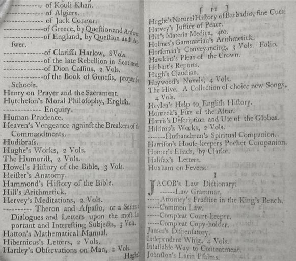 | Keywords: 1755 GarratNoel NY BostonPublicLibrary p10.jpg From A catalogue of books in history divinity law arts and sciences and the several parts of polite literature to be sold by Garrat Noel bookseller in Dock-Street New York New-York Printed by H Gaine in Queen-Street between the Fly and Meal-Markets 1755 24 p ; 16 cm Courtesy of the Trustees of the Boston Public Library/Rare Books 1755 Printed by H Gaine PD-old-100 Garrat Noel | ||||