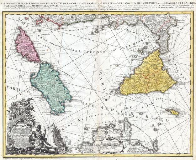 | Keywords: 1762 Homann Heirs Map of Sicily, Sardenia, Corsica and Malta (ITALY) - Geographicus - RegniSicilia-homannheirs-1762.jpg This is one of the Homann Heirs finest and most appealing maps of southern Italy Sicily and Sardinia Covers the region from Corsica and the boot of Italy south to Tunisia and North Africa Includes the island of Malta in the lower right quadrant Lower left quadrant offers an elaborate title cartouche with a sailing ship armorial shields of Sicily Sardinia and Malta and a warrior possibly Persus bearing Medusa shield Geographically speaking the map is generally accurate though the coastlines do indicate some improvements and updates over previous Homann maps Rougly translated the lengthy title reads The Kingdoms of Sicily and Sardinia with Adjacent Island of Corsica Elba Malta and Liparee or Vulcano and the beaches of Northern Africa and Southern Italy Represented as geographically accurate as possible bearing on their legitimate situation in the Mediterranean under the supposition of established geography of the Reial Acadmey of Sciences proportional to the graduated globe of the Earth; reduced to the desired size and composition by Mr G A B Rizzi Zannoni Professor of Geography of the Cosmographic Company of Nuremburg for the Heirs of Homann MDCCLXII This map was drawn by G A b Rizzi Zannoni N Padovano for inclusion the 1752 Homann Heirs Maior Atlas Scholasticus ex Triginta Sex Generalibus et Specialibus ¦ Most early Homann atlases were made to order or compiled of individual maps at the request of the buyer However this rare atlas composed of 37 maps and charts was issued as a suggested collection of essential Homann Heirs maps A fine copy of an important map 1762 dated Size in 22 5 19 object history credit line accession number RegniSicilia-homannheirs-1762 Geographicus-source PD-Art-100 Giovanni Antonio Rizzi Zannoni Italy in the 1760s 1762 in Italy Maps of the Kingdom of Sicily 1762 maps Maps by Homannsche Erben Old maps of Sicily Old maps of Sardinia Old maps of Corsica Old maps of Calabria |