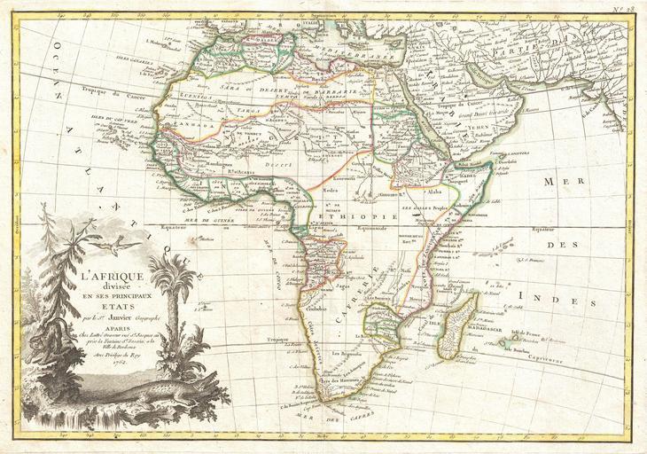 | Keywords: 1762 Janvier Map of Africa - Geographicus - Africa-janvier-1762.jpg A beautiful example of Jean Janvier's 1762 map of Africa Covers the entire continent as well as the Island of Madagascar and adjacent parts of Persia and Arabia Divided into various regions with color-coding according to the colonial power active in the region Course of the Nile follows the Ptolemaic two lake theory Shows the Mountains of the Moon just south of the Ptolemaic lakes In southeastern Africa there is a long lake speculatively drawn in and labeled L Maram but which most likely represents an embryonic Lake Tanganyika Much of central Africa is blank suggesting the profound lack of knowledge of the interior Nonetheless several major river systems including the Niger the Congo and parts of the Nile to show indications of active exploration Names numerous African kingdoms and tribal groups throughout though admittedly few correspond with the groups we know today In the lower left hand quadrant there is an elaborate decorative title cartouche exhibiting a Nile crocodile a leopard vegetation a bird and a waterfall - possibly one of the Nile cataracts Drawn by J Janvier for issue as plate no 23 in Jean Lattre's 1775 issue of the Atlas Moderne 1762 dated Size in 17 5 12 object history credit line accession number Africa-janvier-1762 Lattre Jean <i>Atlas Moderne ou Collection de Cartes sur Toutes les Parties du Globe Terrestre</i> c 1775 Geographicus-source PD-old-100 1760s maps of Africa 1762 maps Maps by Jean Janvier Images from Geographicus |