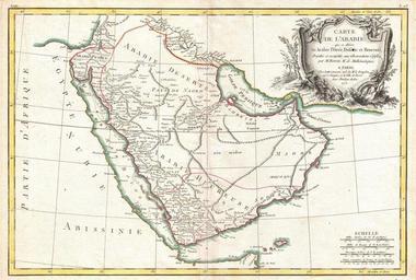 Keywords: 1771 Bonne Map of Arabia - Geographicus - Arabia-bonne-1771.jpg Assessments 1 1 مِثالٌ جميل عن خارطة ريگوبرت بون المُزينة والعائدة إلى سنة 1771م والتي يُصوِّرُ فيها شبه الجزيرة العربيَّة تُغطي هذه الخارطة المنطقة المُمتدَّة من ساحل البحر المُتوسِّط وُصولًا إلى المُحيط الهندي، ومن البحر الأحمر حتَّى الخليج العربي، شاملةً بذلك عدَّة دُول مُعاصرة هي السُعوديَّة، وفلسطين، والأُردُن، والكُويت، والعراق، واليمن، وعُمان، والإمارات العربيَّة المُتحدة، والبحرين كما تظهر فيها أسماء عدَّة مواقع، مثل طور سيناء، ومكَّة المُكرَّمة، وبيت المقدس، بالإضافة إلى الكثير من المُدن والواحات الحضريَّة الأُخرى لاحظ كذلك ما تمَّ الإشارة إليه من الشواطئ الضحلة والحُيود المرجانيَّة في كُلٍ من البحر الأحمر والخليج العربي يظهرُ في الطرف الأيمن العُلوي من الخارطة خرطوشة عنوان مُزخرفة باليد تُعتبرُ هذه الخريطة إحدى أروع خرائط المنطقة المُشار إليها المرسومة باليد في زمانها راسمها هو الفرنسي ريگوبرت بون، وقد أتمها سنة 1771م وقد استُعملت في مُؤلّف جان لاتر لِسنة 1776م المُسمَّى «الأطلس المُعاصر» A beautiful example of Rigobert Bonne's 1771 decorative map of the Arabian Peninsula Covers from the Mediterranean to the Indian Ocean and from the Red Sea to the Persian Gulf Includes the modern day nations of Saudi Arabia Palestine Jordan Kuwait Iraq Yemen Oman the United Arab Emirates and Bahrain Names Mt Sinai Mecca and Jerusalem as well as countless other cities and desert oases Also notes numerous offshore shoals reefs and other dangers in the Red Sea and the Persian Gulf There is a large decorative title cartouche in the upper right hand quadrant A fine map of the region Drawn by R Bonne in 1771 for issue as plate no A 25 in Jean Lattre's 1776 issue of the Atlas Moderne 1771 dated Size in 18 25 12 5 object history credit line accession number Arabia-bonne-1771 Lattre Jean <i>Atlas Moderne ou Collection de Cartes sur Toutes les Parties du Globe Terrestre</i> c 1775 Geographicus-source PD-old-100 Maps by Rigobert Bonne Maps of the Arabian Peninsula 1771 maps Maps of the Red Sea French language maps of Asia Harbours in Egypt Featured pictures on Wikipedia Arabic |