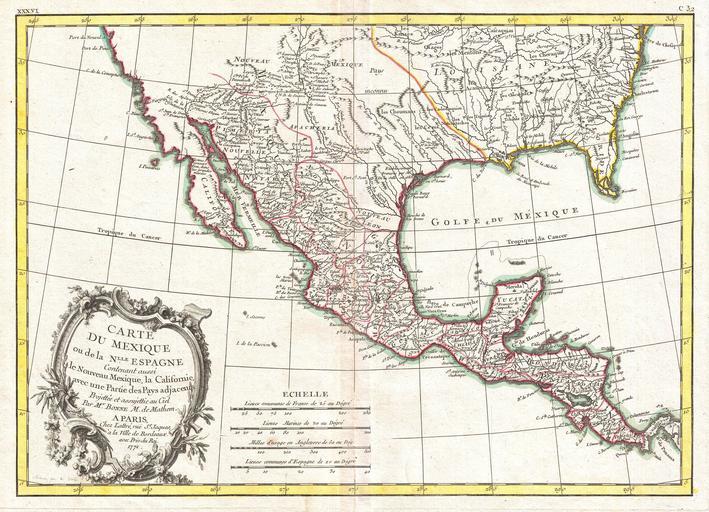 Keywords: 1771 Bonne Map of Mexico (Texas), Louisiana and Florida - Geographicus - Mexico-bonne-1771.jpg A beautiful example of Rigobert Bonne's 1771 map of Mexico and Florida Covers from Baja California eastward to Florida and Carolina extend northwards as far as the mouth of the Chesapeake Bay and southwards to Panama Bonne being a very cautious cartographer abandons many of the fictious elements common to many period maps of this region thus most unexplored areas are left blank Being primarily a map of Mexico and the Spanish holdings in North America this excellent map details the various Mexican states naming countless towns villages and haciendas The map extends northward into the vast and largely unknown American West Identifies numerous missionary stations along the Rio Bravo or Rivera du Nord Rio Grande extending well northing to New Mexico towards Santa Fe Also names the various American Indian groups who traded with the French in Louisiana Southern Florida is rendered as an archipelago in a primitive attempt at describing the Everglades Drawn by R Bonne in 1771 for issue as plate no C 32 in Jean Lattre's 1776 issue of the Atlas Moderne 1771 dated Size in 16 12 object history credit line accession number Mexico-bonne-1771 Lattre Jean <i>Atlas Moderne ou Collection de Cartes sur Toutes les Parties du Globe Terrestre</i> c 1775 Geographicus-source PD-old-100 Old maps of Mexico Maps of the Viceroyalty of New Spain Old maps of Central America Old maps of North America 1771 maps Mexico in the 18th century Maps in French |