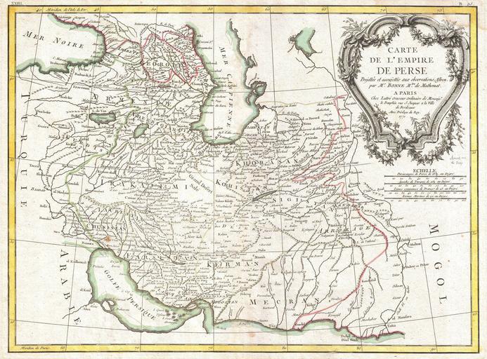 | Keywords: 1771 Bonne Map of Persia ( Iran, Iraq, Afghanistan ) - Geographicus - Persia-bonne-1771.jpg Artwork en A beautiful example of Rigobert Bonne's 1771 decorative map of the Persia Covers from the Black Sea south to the Persian Gulf and east past the Caspian Sa to the Indus Valley Includes the modern day nations of Iran Iraq Kuwait Afghanistan Georgia Armenia Azerbaijan with parts of adjacent Turkey Saudi Arabia and Pakistan Names numerous tribal areas villages cities deserts caravan routes and river systems A large decorative title cartouche bearing garlands appears in the upper right hand quadrant A fine map of the region Drawn by R Bonne in 1771 for issue as plate no B 25 in Jean Lattre's 1776 issue of the Atlas Moderne Paris / 1771 dated Size in 17 5 12 75 accession number Persia-bonne-1771 object history credit line Lattre Jean <i>Atlas Moderne ou Collection de Cartes sur Toutes les Parties du Globe Terrestre</i> c 1775 Geographicus-source PD-old-100 https //www raremaps com/gallery/detail/19249/Carte_De_LEmpire_De_Perse_1771/Bonne html Barry Lawrence Ruderman Antique Maps Inc PD-Art-100 Maps by Rigobert Bonne 1771 maps Old maps of Iran Old maps of Iraq Maps of Kuwait Old maps of Afghanistan 18th-century maps of Georgia Old maps of Armenia 18th-century maps of Azerbaijan Old maps of Turkey Old maps of Saudi Arabia Old maps of Pakistan Old maps of the Caucasus Old maps of the Middle East Old maps of the Caspian Sea Old maps showing the whole Near East Old maps of Shirvan |