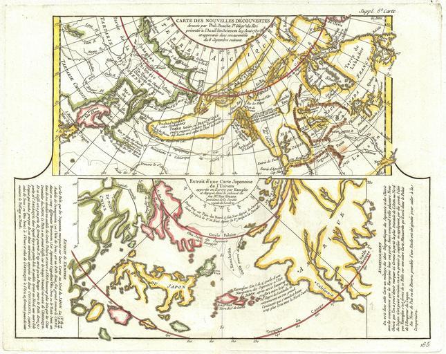 | Keywords: 1772 Vaugondy - Diderot Map of Alaska, the Pacific Northwest and the Northwest Passage - Geographicus - NouvellesDecouvertes-vaugondy-1772.jpg  This is a fascinating combination of two contrasting maps on a single sheet Both maps cover the northeastern parts of Asia and the northwestern parts of North America This two map chart was originally drawn by Phillip Buache to expound upon his theories regarding the northwest coast of America and more specifically upon the possibility of a Northwest Passage The upper map entitled Carte des Nouvelles Decouvertes is a combination of data absconded from the Russian Academy of Sciences and Buache ™s speculations on the Northwest Passage When Joseph-Nicholas de L ™Isle younger brother of the better known Guilleme de L ™Isle returned from his tenure at Russian Tzar Peter the Great ™s Academy of Sciences he decided to publish a compilation of secret cartographic data obtained from previously unknown Russian expeditions to Kamtschaka and the coast of Siberia These seminal explorations included the discoveries of Tchirikow Frondat Bering among others De L ™Isle produced a ground breaking and largely accurate mapping of the peninsula of Kamchatka and the coast of northeast Asia - shown here De L ™Isle contracted Buache already a prominent cartographic figure due to his introduction of hachures as a method for displaying elevation on a two dimensional plane to complete the North American part of the map Buache used the mythical voyages of Admiral de Fonte and Juan de Fuca as his cartographic source material The two sides of this map therefore could not be more heavily contrasted for the mapping of Asia is largely accurate where the mapping of North America is almost entirely fantastical This map shows the Sea of the West supposedly discovered by Fuca as well as the series of lakes rivers and canals heading eastward toward the Baffin and Hudson Bays that were purportedly first identified by De Fonte These include Lac de Fonte Lac Belle and Lac de Valasco The Aleutian Islands are drawn based upon various recorded land sightings by Russian explorers in the early 18th century as a single peninsular land mass This map also traces the voyages of Kamtchatka St Antoine and unnamed Russian explorers Buache and De L ™Isle presented this map to the French Academy of Sciences in 1762 The lower map is a supposed recreation of an early Japanese Map discovered by Englebert Kaempfer and presented to Hans Sloane President of the Royal Society of London Kaempher was a German traveler who spent two years in Japan attached to the Dutch Embassy When he returned to Europe he carried with him numerous documents including an earlier state of the bottom map on this sheet Displays Asia crudely with only Japan many times its actual size displayed with any relative accuracy This map does however include the Great Wall of China and Baja California “ drawn with the hint of a Northwest Passage To the left of the lower map is an extract from the Journals of Kaempfer describing Japan and its knowledge of America To the right side of the lower map is an advertisement claiming the source of this map to be a wall map in the Emperor ™s palace in Japan This map is part of the 10 map series prepared by Vaugondy for the Supplement to Diderot ™s Encyclopédie of which this is plate 6 This seminal map series exploring the mapping of North American and specifically the Northwest Passage was one of the first studies in comparative cartography 1772 undated Size in 15 5 12 5 object history credit line accession number NouvellesDecouvertes-vaugondy-1772 Supplement to Diderot's <i>Encyclopédie ou dictionnaire raisonné des sciences des arts et des métiers </i> or Vaugondy's <i>Recueil de 10 Cartes Traitant Particulierement de L'Amerique du Nord</i> 1779 Geographicus-source PD-Art-100 Robert de Vaugondy Old maps of Alaska Old maps of Canada 1772 maps Northwest Passage Old maps of the Arctic Philippe Buache Old maps of the Russian Empire Old maps of Asia Old maps of North America |