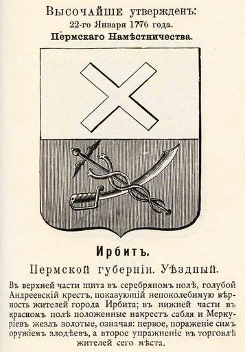 Keywords: Ирбит 1776 из Винклера.jpg Official Russian Empire Irbit coat of arms Ге б уездного го ода И бит Пе мской губе нии Российской Импе ии с официальным описанием в Ге бовнике Павла Пет овича Винкле а П П фон-Винкле Ге бы го одов губе ний областей и посадов Российской Импе ии внесенные в Полное Соб ание законов с 1649 по 1900 год Дозволено цензу ою С -Пете бу г 20 Июля 1899 года Издание книгото говца Ив Ив Иванова С -Пете бу г Типог афия И Комелова П яжка д 3 1899 / Scanned 1776 / 1899 published П П фон Винкле / Pavel von Vinkler PD-old PD-RusEmpire PD-RU-exempt coats of arms Gerbovnik Vinklera - City CoAs Coats of arms of Perm Governorate Crosses in heraldry Sabres in heraldry Snakes in heraldry |