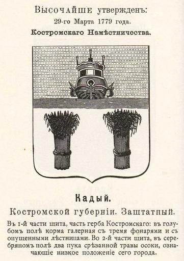 Keywords: Кадый 1779 из Винклера.jpg Official Russian Empire Kadyi coat of arms Ге б заштатного го ода Кадый Кост омской губе нии Российской Импе ии с официальным описанием в Ге бовнике Павла Пет овича Винкле а П П фон-Винкле Ге бы го одов губе ний областей и посадов Российской Импе ии внесенные в Полное Соб ание законов с 1649 по 1900 год Дозволено цензу ою С -Пете бу г 20 Июля 1899 года Издание книгото говца Ив Ив Иванова С -Пете бу г Типог афия И Комелова П яжка д 3 1899 / Scanned 1779 / 1899 published П П фон Винкле / Pavel von Vinkler PD-old PD-RusEmpire PD-RU-exempt coats of arms Gerbovnik Vinklera - City CoAs Coats of arms of Kostroma Governorate Boats in heraldry