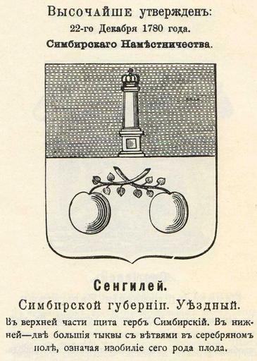 | Keywords: Сенгилей 1780 из Винклера.jpg Official Russian Empire coat of arms Sengilei Ге б Российской Импе ии уездного го ода Сенгилей Симби ской губе нии с официальным описанием в Ге бовнике Винкле а П П фон-Винкле Ге бы го одов губе ний областей и посадов Российской Импе ии внесенные в Полное Соб ание законов с 1649 по 1900 год Дозволено цензу ою С -Пете бу г 20 Июля 1899 года Издание книгото говца Ив Ив Иванова С -Пете бу г Типог афия И Комелова П яжка д 3 1899 \ Scanned by Vizu 1780 \ 1899 published П П фон Винкле \ Pavel von Vinkler PD-old PD-RusEmpire PD-RU-exempt coats of arms <references/> Gerbovnik Vinklera - City CoAs Coats of arms of Simbirsk Governorate Дыня in heraldry |