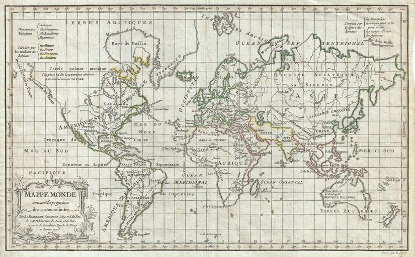 Keywords: 1784 Vaugondy Map of the World on Mercator Projection - Geographicus - World-vaugondy-1784.jpg This uncommon 1784 map of the world on a Mercator projection by Robert de Vaugondy occupies the ephemeral period between Captain Cook ™s second and third voyages Cooks explorations along the eastern coast of Australia as well as around New Caledonia and are in evidence while his later work in the Pacific including his important exploration of American northwestern coastline is noticeably absent Instead the northwest coast of America is loosely ghosted in with minor inland notations regarding the fictional discoveries of Admiral de Fonte Barthlomew de Fonte was supposedly a Spanish Admiral who sailing up the Pacific coast c 1640 discovered a series of gigantic lakes seas and rivers heading eastward towards the Hudson Bay Upon one of these great inland lakes he met with a ship from Boston that claimed to have come through a Northwestern Passage De Fonte ™s story appeared in a short lived 1706 English publication entitled Memoirs of the Curious The story inspired no less than Joseph-Nicholas de L ™Isle younger brother of the better known Guilleme de L ™Isle Joseph-Nicholas was at the time employed by the Russian Tzar Peter the Great in the compilation of Russian surveys and discoveries in Siberia and the extreme northeast of Asia When he published his somewhat accurate map of northeast Asia he paradoxically decided to include on the same page an entirely speculative map of North America based largely on De Fonte ™s letter De L ™Isle ™s mantle was later taken up by Jefferys another ardent supporter of the Northwest Passage theory who incuded De Fonte ™s discoveries in his own map of the region which was ultimately the inspiration for this map by Vaugondy Elsewhere on this map Tasmania or Van Dimenians land is erroneously attached to the Australian mainland Similarly between Korea and Kamtschatka Hokkaido Japan ™s northernmost island is attached to Sakhalin “ a common error of the period This map typically appears in one of three color schemes designed to illustrated either world religious skin tone or race This particular example is colorized to emphasize the predominance of various skin tones in different parts of the world Whites les Blancos are represented by green brown skin les Bruns are identified by red yellow skin les Juanatres by yellow and olive skin les Olivatres by light green Published by Robert de Vaugondy in the 1784 eidition of his Nouvel Atlas Portatif 1784 undated Size in 15 5 9 5 object history credit line accession number World-vaugondy-1784 Vaugondy R <i>Nouvel Atlas Portatif</i> 1784 Geographicus-source PD-Art-100 1780s maps of the world Didier Robert de Vaugondy 1784 maps Maps in French |
