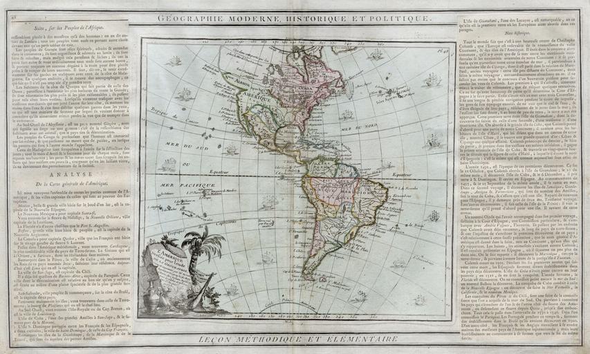 | Keywords: 1786 Brion de la Tour Map of South and North America - Geographicus - Amerique-brion-1786.jpg A hard to find 1786 map of the North America and South America by French cartographer Louis Brion de la Tour Depicts the whole of North and South America with several interesting cartographic features The American northwest is largely ill defined though highly suggestive of the French conception of a water route through North America Notations indicate a great Sea of the West but the exact location of this is left undefined The region of the Apache American Indian tribe is noted and the Pacific Northwest is labeled Albion Texas is labled Nouvelle Mexique and shows as distinct from Mexico or Nouvelle Espagne In South America Bogata is located in Terre Ferme and some early colonial cities such as Cuzco Lima and La Paz are noted Attractive decorative title cartouche in lower left quadrant Sixteen sailing ships decorate the oceans Descriptive text to either side of the map proper 1786 dated Size in 19 11 object history credit line accession number Amerique-brion-1786 Geographicus-source PD-Art-100 Old maps of the Americas 1786 maps Louis Brion de La Tour Maps in French |
