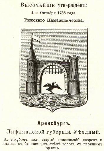 | Keywords: Аренсбург 1788 из Винклера.jpg Official Russian Empire coat of arms Arensburg Ге б Российской Импе ии уездного го ода А енсбу г Лифляндской губе нии в 1788 - Рижского наместничества с официальным описанием в Ге бовнике Винкле а П П фон-Винкле Ге бы го одов губе ний областей и посадов Российской Импе ии внесенные в Полное Соб ание законов с 1649 по 1900 год Дозволено цензу ою С -Пете бу г 20 Июля 1899 года Издание книгото говца Ив Ив Иванова С -Пете бу г Типог афия И Комелова П яжка д 3 1899 \ Scanned 1788 \ 1899 published П П фон Винкле \ Pavel von Vinkler PD-old PD-RusEmpire PD-RU-exempt coats of arms Gerbovnik Vinklera - City CoAs Coats of arms of Liflandia Governorate Castles in heraldry Kreis Ösel |