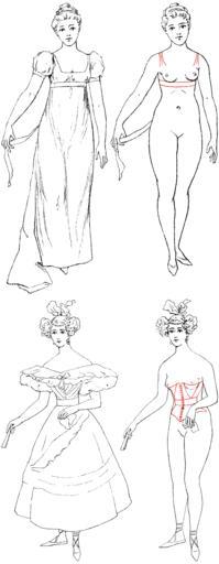 | Keywords: 1800-vs-1830 womens clothing pressure-points.png  Analysis by Carl Heinrich Stratz 1858-1924 of the pressure points of women's clothing styles that is areas where the clothing is held tightly against the outline of the body or from which the weight of the clothing is suspended These are shown in red color in the image Above The pressure-points of ca 1800 high-waisted Empire clothing styles Below The pressure points for ca 1830 narrow-waisted clothing styles Notice that the Empire style does not involve constricting the waist Also the Empire style involves partially suspending the weight of the clothing from the shoulders something considered highly-desirable by many late 19th-century dress-reform advocates and the overall weight of the Empire clothing would have been less than that of the 1830-era clothing ;Upper left Fig 73 Empirecostüm im Jahre 1800 Costümbild aus dem Figaro illustré ;Upper right Fig 74 Körperumrisse von Fig 73 ;Lower left Fig 75 Costümbild aus dem Jahre 1830 Journal des dames ;Lower right Fig 76 Körperumrisse von Fig 75 This image is derived from images Image Empirecostum imJahre1800 gif and Image Costumbild aus demJahre1830 gif uploaded by Haabet Ultimate source Die Frauenkleidung by Dr C H Stratz 1902 pages 135-138 <gallery>File Costumbild aus demJahre1830 gif File Empirecostum imJahre1800 gif</gallery> 1902 Carl Heinrich Stratz 1858-1924 PD-old-auto-1923 1924 1800s fashion Empire silhouette Stratz_-_Die_Frauenkleidung Original upload log wikitable - - 2006-07-27 17 35 34 1160 × 2979 211608 bytes Churchh <nowiki>Analysis by Carl Heinrich Stratz 1858-1924 of the pressure points of women's clothing styles that is areas where the clothing is held tight against the outline of the body or from which the weight of the clothing is suspended These are shown in r</nowiki>  |