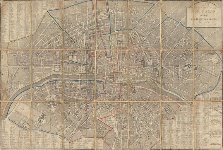 Keywords: 1802 Chez Jean Map of Paris in 12 Municipalities, France - Geographicus - Paris-jean-1802.jpg An extraordinary map of pre-Haussmann Paris and the early Faubourgs suburbs issued in 1802 following Napoleon Bonaparte's 1800 reorganization of the city into 12 Municipalities Covers Paris on both sides of the Seine from the Champ de Mars to Le Trone extends north as far as Montmartre and south roughly to Port Royal Produced at the height of French dominance of the cartographic arts this maps is a fine example the engraver's art Individual buildings fields streets hills valleys orchards and public gardens are revealed in breathtaking detail We can even see the incomplete state of the northern wing of the Louvre Palace There is an elaborate street index on either side and at the bottom of the map In the lower right quadrant appears a list of names of the ministers in charge of the Municipalities This is an update of a similar street plan made by the same publisher in 1797 This type of map known as a Pocket or Case Map is designed with the traveler in mind and while it display's beautifully unfolded is designed to fold and fit in a vest or coat pocket It accordance with its purpose the map has been dissected and mounted on linen in 21 sections This system was devised in the 18th century to protect folding maps against damage caused by repeated folding and unfolding The linen backing absorbs the stress of folding and can easily be mended or replaced this preserving the integrity of the actual paper document 1802 dated Size in 33 22 56 object history credit line accession number Paris-jean-1802 Geographicus-source PD-old-100-1923 Maps of Paris in the 19th century 19th-century maps of Paris 1802 maps Maps in French 1802 in Paris |