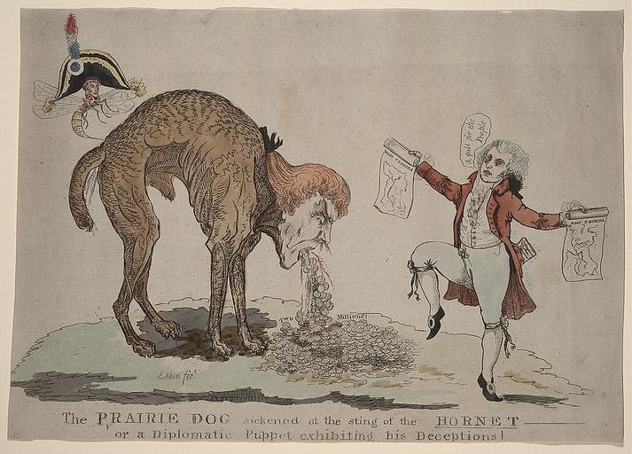 | Keywords: 1804 prairie dog sickened at the sting of the hornet or a diplomatic puppet exhibiting his deceptions byJamesAkin LC.jpg  Title The prairie dog sickened at the sting of the hornet or a diplomatic puppet exhibiting his deceptions / James Akin fect Creator s Akin James ca 1773-1846 artist Date Created/Published Newburyport Mass s n 1804 Medium 1 print on pale blue-grey laid paper etching with watercolor ; 28 5 x 40 6 cm sheet Summary James Akin's earliest-known signed cartoon The Prairie Dog is an anti-Jefferson satire relating to Jefferson's covert negotiations for the purchase of West Florida from Spain in 1804 Jefferson as a scrawny dog is stung by a hornet with Napoleon's head into coughing up Two Millions in gold coins the secret appropriation Jefferson sought from Congress for the purchase On the right dances a man possibly a French diplomat with orders from French minister Talleyrand in his pocket and maps of East Florida and West Florida in his hand He says A gull for the People Notes The print was probably published in Newburyport Massachusetts where Akin was working in 1804-6 Repository Library of Congress Prints and Photographs Division Washington D C 20540 USA http //www loc gov/pictures/item/2002708977/ 1804 Creator James Akin 1846 James Akin 1804 in the United States Caricatures of Thomas Jefferson Caricatures of Napoleon I of France 1804 cartoons 1800s political cartoons of the United States |