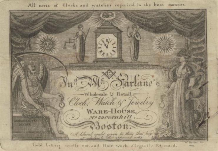 | Keywords: 1812 McFarlane Boston.png en All sorts of clocks and watches repaired in the best manner Jn S McFarlane's wholesale retail clock watch jewelry ware-house no 59 Cornhill Boston 1812 American Broadsides and Ephemera Series 1 McFarlane 1812 Boston in the 1810s Shops in Boston PD-old-100 |