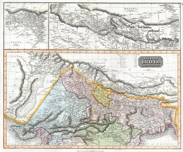 | Keywords: 1814 Thomson Map of Northern India and Nepal - Geographicus - IndiaNepal-t-1814.jpg This fascinating hand colored 1814 map by Edinburgh cartographer John Thomson depicts northern India and Nepal Bounded on the east by Persia and the Indus valley on the North by Tibet on the south by Berar and on the east by Assam and Bhutan Much of the upper portion of this map includes a detailed inset of the Kingdom of Nepal or Nepaul This area is depicted in impressive detail considering that when this map was printed very few western travelers had ever been to Nepal Includes roads mountain passes and the residences of important Lamas Extends fully into the Tibetan plateau as far as Te Shoo Loomboo and the Road to Lhasa Lassa The right hand corner of this map contains an inset of Kabul or Cabul 1814 Size in 25 20 object history credit line accession number IndiaNepal-t-1814 Geographicus-source PD-old-100 Maps by John Thomson Old maps of North India Old maps of Nepal Old maps of Pakistan 1814 maps of India 1814 in Nepal |