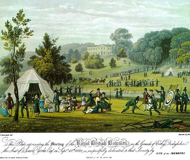 | Keywords: 1823 Royal British Bowmen archery club.jpg J Townshend A print of the 1822 meeting of the Royal British Bowmen archery club 1823 engraving cm object history exhibition history credit line Notice that both men and women members of the society have uniforms the women's uniform was a green dress with yellow at the shoulder puffs and yellow triangles at the bottom hem In the 1806 book Microcosm by William Henry Pyne a number of these archery clubs are mentioned along with a brief capsule history of both working and hobby archery At the time archery was one of the few competitive sports that adult women of the genteel classes could respectably engage in others were battledore/shuttlecock -- a precursor to badminton -- and for a tiny social elite old-fashioned court tennis For a less documentary picture of lady archers see File 1799-pinup-print-archers-Adam-Buck-unbound-hair jpg accession number place of creation Scanned by H Churchyard PD-old-100 1823 engravings Archery in art Fashion in 1822 Archery in Wrexham County Borough Marchwiel |